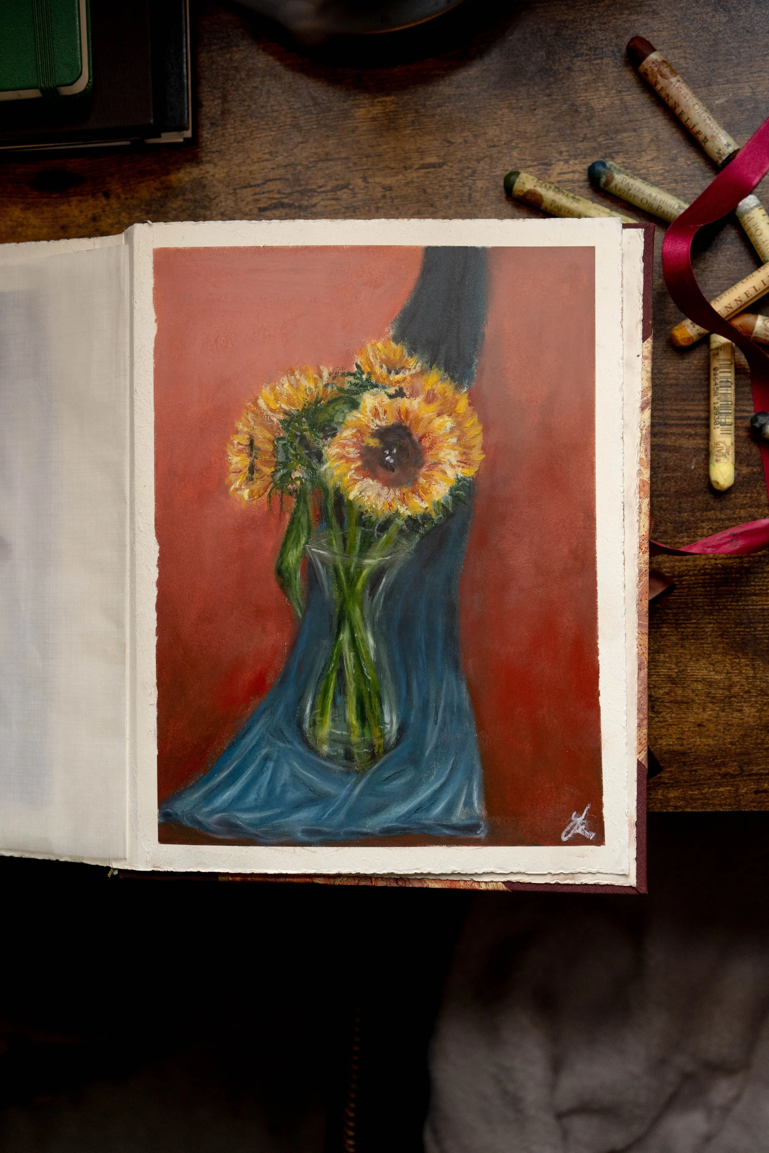 the rich, creamy texture of oil pastels allows me to craft and blend forms with a beautiful depth and dimension. their extended workability lets me refine details, while they gradually set over time for a stable finish. to preserve the integrity of each piece, i apply a fixative spray. for longevity, i recommend framing originals under glass.
